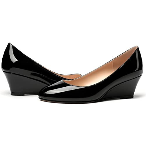 MERRORI Women's Slip On Round Toe Solid Patent Wedge Low Heel Pumps Shoes 2 Inch 5