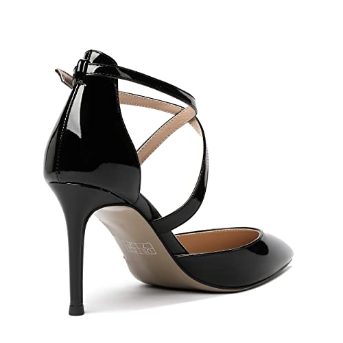 MODENCOCO Women's Cut Out Criss Cross Strap Patent Pointed Toe Stiletto High Heel Pumps Shoes 3.5 Inch 3