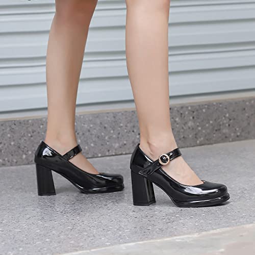 Elbslutt Women's Patent Leather Chunky Mary Janes Platform Square Toe High Block Heels Ankle Strap Pumps 5