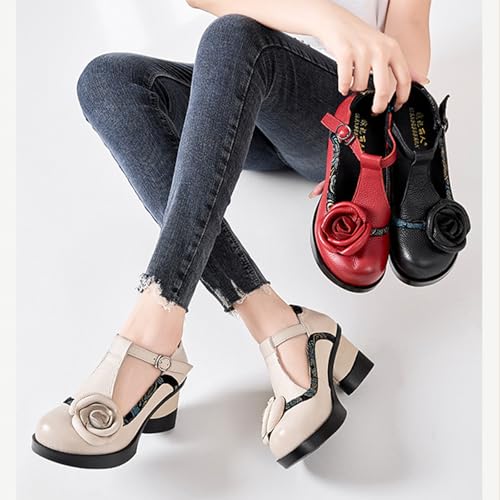 Women's Genuine Leather Mary Jane Chunky Heel Shoes Classic Round Toe Flowers T Strap Mid Block Heel Dress Pumps Grace Party Wedding Bridal Shoes 4
