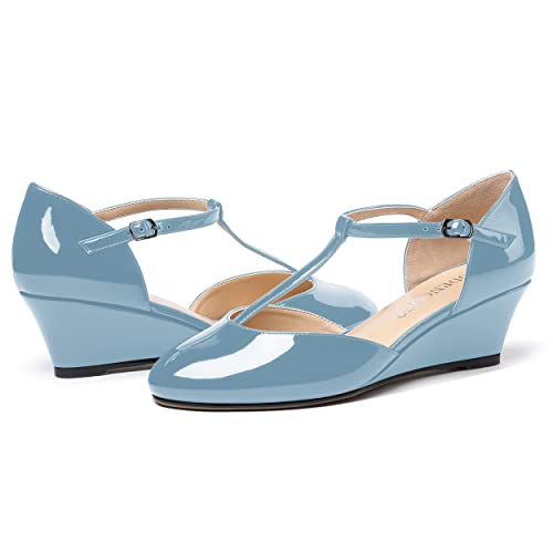 MODENCOCO Women's Dating T Strap Buckle Round Toe Fashion Patent Wedge Low Heel Pumps Shoes 2 Inch 5