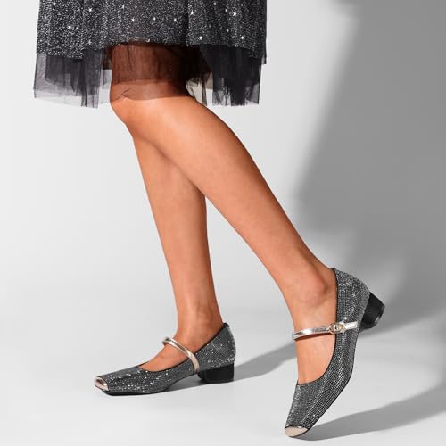 HOT ! TDD Mary Jane Shoes Women 1 Inch Low Heels Chunky Block Square Toe Dress Pumps Vintage Dressy Strap Comfortable Zapatos Width Buckle Classy Rhinestone Crystal