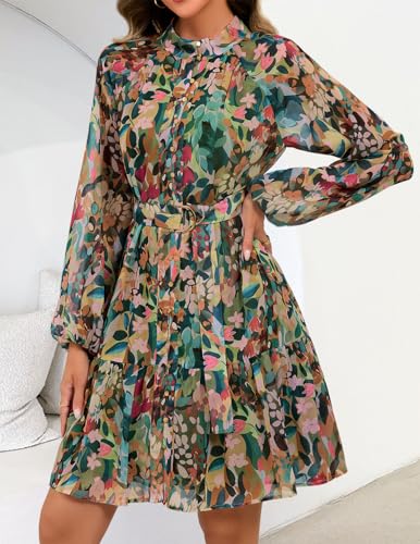 ZESICA Womens Fall Floral Mini Dress 2025 Long Sleeve Button Down Chiffon A Line Flowy Short Shirt Dresses with Belt 1