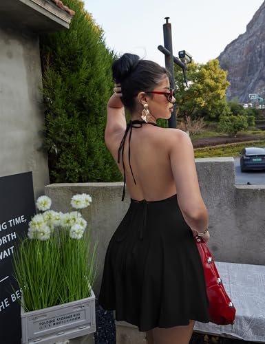 BEAGIMEG Women's Sexy Bodycon Sleeveless Halter Tie up Back Backless Deep V A-line Club Party Mini Dress 1