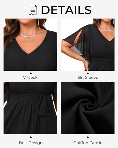 • Features: This plus size chiffon dress for curvy women features knee length, v-neck, flutter short sleeves with slit, belted design, high waist and A-line high low hem, making it wearable in spring, summer and fall