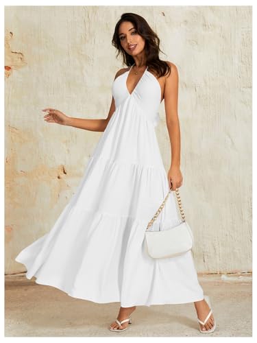 HOT ! OYOANGLE Women's V Neck Tie Backless Halter Dress Ruched Flowy Wedding Vacation Maxi Dresses