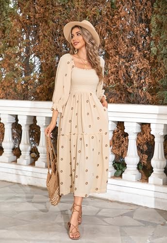 • FEATURES: Summer Dresses for Women / Spring Dresses / Wedding Guest Dresses / Easter Dresses / Cottagecore Dress / Western Dress / Peasant Dress / Photoshoot Dress / Tea Party Dresses / Country dress / Hippie dress / Mexican Dress / Vacation Dresses / Fit and Flare Dress. It Has Puff Long Sleeve, Square Neck, Floral Embroidered, Empire Waist, Ruffle Cuffs, Two Side Pockets, Elastic Design at the Shoulder, Cuffs and Chest, Pleated Details at waist, A Line Tiered Ruffle Flowy Hem and Midi Length.