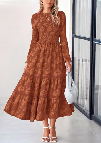 PRETTYGARDEN Long Sleeve Dress for Women 2025 Fall Elegant Modest Floral Boho Smocked Flowy Wedding Guest Midi Dresses 2