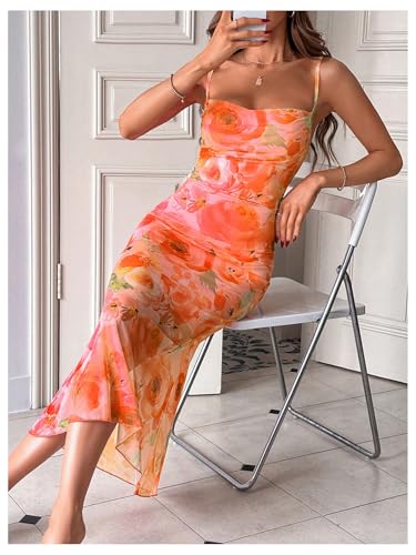 GORGLITTER Women's Floral Ruched Bodycon Midi Dress Mesh Fishtail Summer Wedding Guest Cocktail Going Out Dresses 2025 2