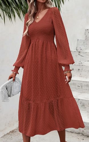 • FLOWING FABRIC: Soft and comfortable fabric makes this cute swiss dot midi dress drap nicely; This v neck long sleeve dress is made of premium material to give you the maximum comfort; The smocked dress women should be the new trendy fall dresses for women 2025