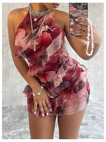 • Feature: Floral Print, Ruffle Trim, Sleeveless, Tie Backless, Halter Neck, Mini Short Length, Bodycon Dress for Women, Party Dress For Women, Ruffle Dress