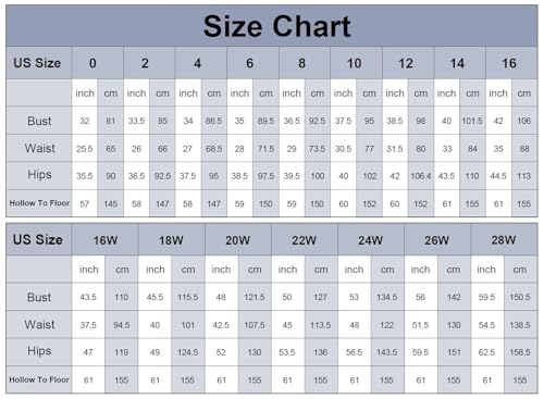 • 【Size and customize】 Please reference our SIZE CHART on the image. It is more accurate to use our size chart to choose your size. If you are between two sizes, please choose either the larger size or the free customized service. For the customized dress, please choose the size closest to your own size when you place the order and email us the measurements of bust, waist, hips and hollow to floor. We will make the dress fits you perfect