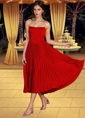 Women's Strapless Bridesmaid Dresses Tea Length Ruffle Satin Formal Prom Dress DK027 1
