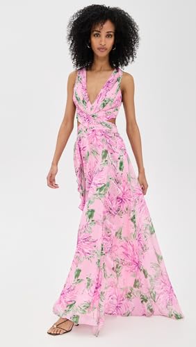 • Pintuck bodice with cutout at waist , Lace-up at back , Cascading ruffles , Floral print, Side slit