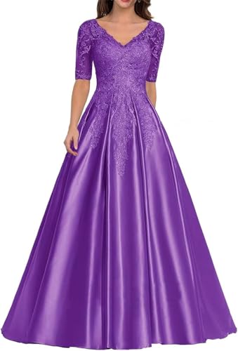More information about V Neck Mother of The Bride Dress Long Satin Prom Dresses Lace Applique Formal Evening Gown with Sleeve
