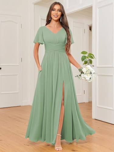 Chiffon Flutter Sleeve Bridesmaid Dresses with Slit Pockets V-Neck Long A-Line Ruched Formal Wedding Party Dress 4