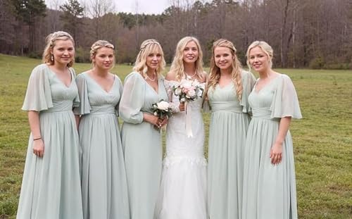 More information about Chiffon Flutter Sleeve Bridesmaid Dresses with Slit Pockets V-Neck Long A-Line Ruched Formal Wedding Party Dress