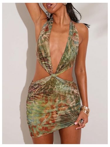 More information about WDIRARA Women's Tropical Cut Out Halter Dress Deep V Neck Backless Bodycon Mini Dresses