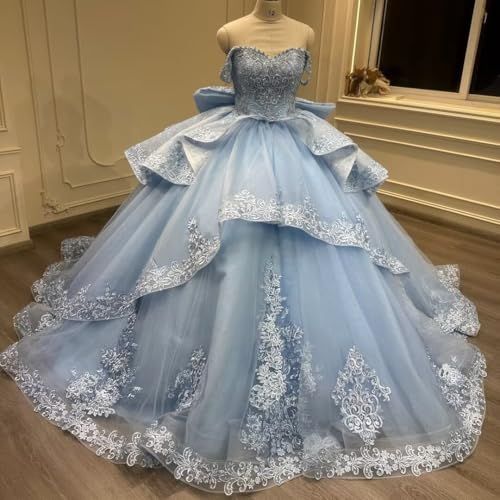 More information about Mouccy Lace Quinceanera Dresses Ball Gown Puffy Beaded Sweet 16 Dresses with Ruffles Off Shoulder Pageant Dresses with Bow