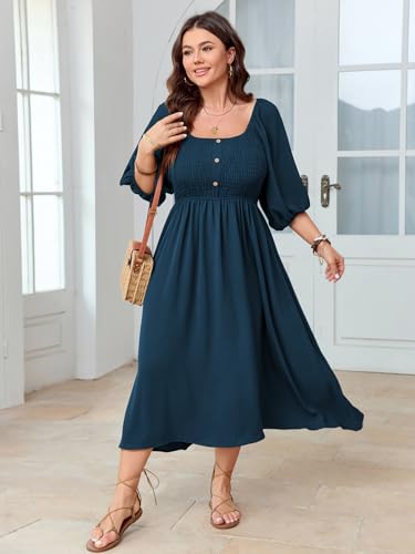 HOT ! Women's Plus Size Casual Dresses Square Neck Button Up Smocked 3/4 Puff Sleeve Empire Wasit A-line Flowy Midi Dress