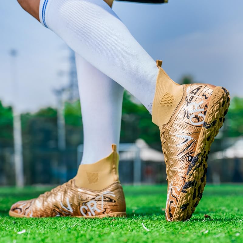 • Multifunctional design: high-top football cleats featuring sock-like construction, ideal for training and matches on artificial turf, available in eye-catching pink, gold, black, and purple colorways.