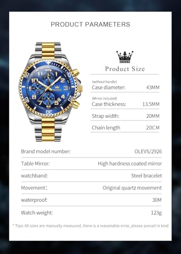 • Details of the watch: Imported quartz analog movement and battery, Mirror Diameter 43MM, case thickness 13.5MM, band length: 200MM, weight 123G, water-resistant to 30M