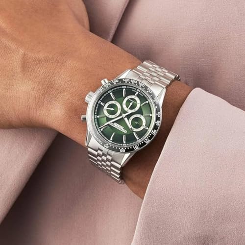 • Case diameter: 43.5 mm,case thickness: 14 mm, case colour: Silver and dial colour: Green