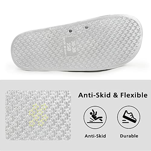 • [Enhanced Non-Slip Sole & Exceptional Durability]: The non-slip sole of these glitter slides features an enhanced texture, resulting in a doubled anti-skid performance. The unique texture not only ensures excellent slip resistance but also adds aesthetic appeal. Furthermore, its remarkable toughness guarantees prolonged wearability.