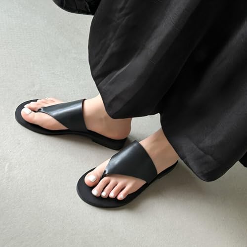 HOT ! Womens Leather T-Strap Slip On Flat Flip Flops Comfortable Round Toe Non Slip Sole Flat Thong Sandals For Beach Daily Casual Vacation Summer Pool