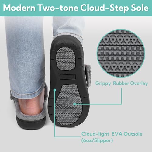 • The two-tone EVA sole with grippy rubber overlay blend modern style with cloud-like lightness( 6oz/slipper) and slip-resistant confidence
