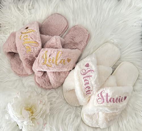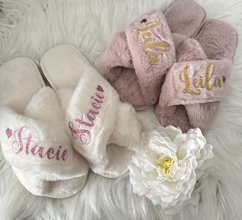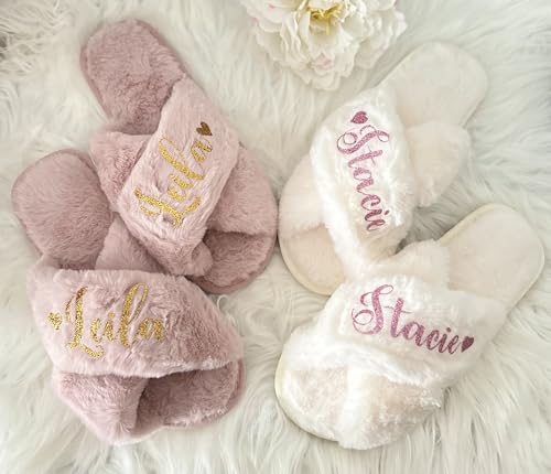 • PERSONALIZED WOMENS SLIPPERS: These fluffy criss cross slippers for women can be personalized with name, title and little hearts.