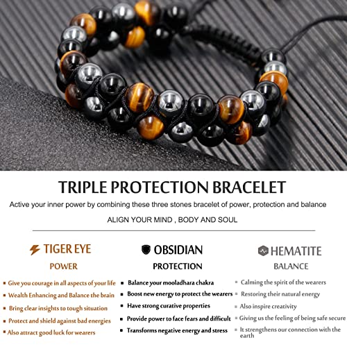 HASKARE Triple Protection Bracelet, Genuine Tigers Eye Black Obsidian and Hematite 8mm Beads Bracelet for Men Women, Crystal Jewelry Stone Bracelets Christmas Gifts for Men Bring Luck Prosperity 2