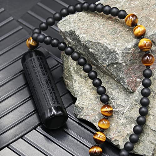 • 【HANDCRAFT CRYSTAL PENDANT】Black obsidian necklaces for men is made of black obsidian, and engraved with Buddhist scriptures in Chinese characters. The chain consists of 108 beads, including one hundred 6mm black onyx beads and eight 8mm tiger eye beads.