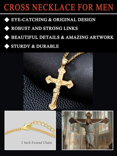 • CRUCIFIX DESIGN - The crucifix is a cross with an image of Jesus on it, a powerful symbol in Christianity that will always remind us of Jesus' sacrifice and love. This gold crucifix necklace will show your devotion to your faith and complement your style.