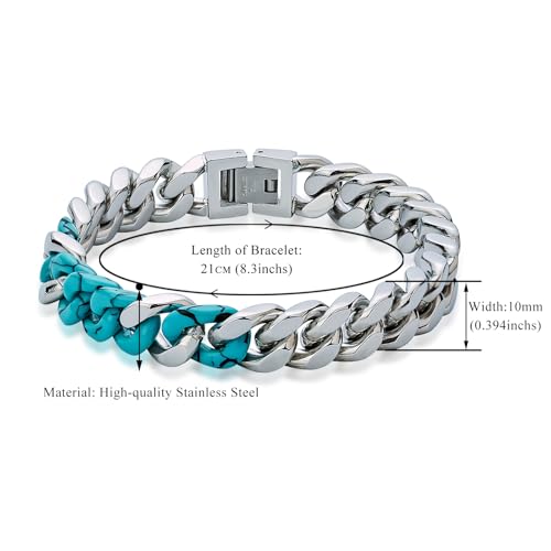 • Product specifications: The Length of this men's turquoise cuban bracelets: 21CM (8.3'') and the Width: 10MM(0.39"). Main materials: stainless steel, synthetic materials. Accessories: exquisite packaging box