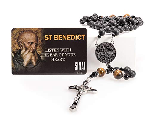 HOT ! St Benedict Black Rosary Beads Catholic – Rugged Onyx Rosary – Handcrafted Stone Antique Rosary with Stainless Steel St Benedict Crucifix and Medal - Rosarios Catolicos para Hombre