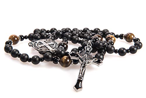 • SIZING INFORMATION – this rosary for men weighs 2.8oz and measures 22” in length, has a loop length of 14.5”, a medal diameter of 0.9’’, crucifix length of 2’’ and a crucifix width of 1.2”. The Our Father, polished tiger eye beads are 8mm and the Hail Mary (decades) matte black onyx measures 6mm