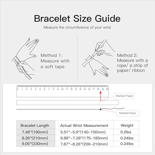 • ★SIZE: Length 9.05in (23cm); Width 0.51in (13mm).Fits Wrists 7.87"-8.26"(200-210mm). We provide reference wrist sizes suitable for most people, and selecting based on this will give you a comfortable fit. If you prefer a very looser fit, you can still purchase even if your wrist circumference is slightly smaller than the reference size.