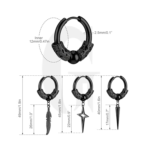 More information about 3 Pairs Dangle Hoop Earrings Set for Men, Surgical Steel Hanging Huggie Hoop Earrings with Spike/Feather/Cross Star Charms