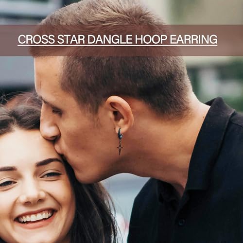 3 Pairs Dangle Hoop Earrings Set for Men, Surgical Steel Hanging Huggie Hoop Earrings with Spike/Feather/Cross Star Charms 6