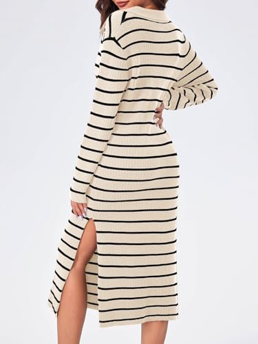 Saodimallsu Womens Striped Sweater Dress Fall Chunky Knit V Neck Collared Long Sleeve Sexy Slit Loose Midi Dresses 1
