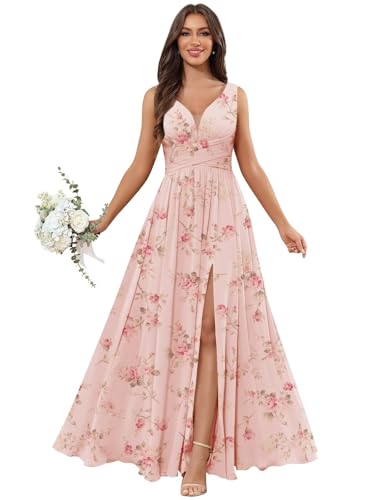 HOT ! Ufashion Women's V Neck Bridesmaid Dresses for Wedding Long Chiffon Pleated Formal Dress Evening Gown with Slit