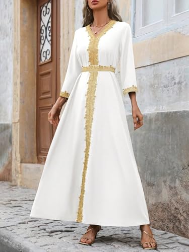 • White Contrast Lace A-Line Colorblock V neck Long Sleeve Regular Sleeve Natural Long Loose Non-Stretch Fabric 95% Polyester 5% Elastane Machine wash or professional dry clean