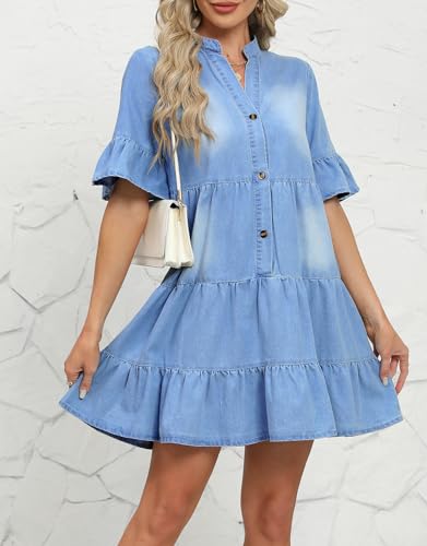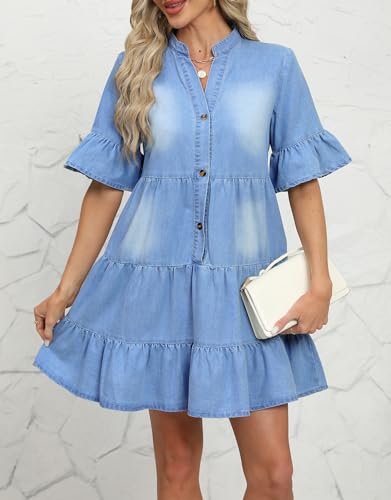 CYLADY Women Denim Dresses Casual V Neck Ruffle Short Sleeve Summer Denim Jean Dress 4