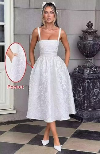 • STYLE: Tea-length white wedding dress featuring an elegant A-line silhouette with a structured bodice and full skirt that falls gracefully to mid-calf