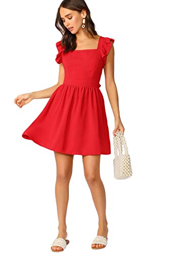 HOT ! OYOANGLE Women's Tie Back Square Neck Ruffle Strap Sleeveless A Line Flare Flowy Lightweight Summer Short Dress