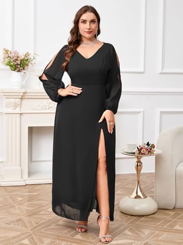 ZOMVA Plus Size Chiffon Maxi Dress V-Neck A-line Long Sleeve Front High Slit Formal Dress Mother of Bride Wedding Guest 1