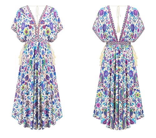 R.Vivimos Women Summer Print Deep V Neck Cotton Beach Long Dresses 1