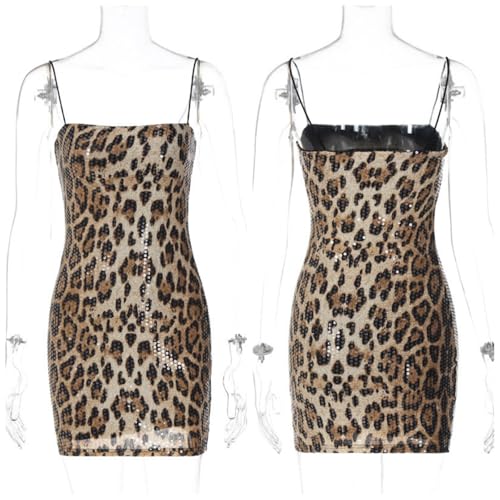 HOT ! ZGMYC Women's Glitter Sequin Leopard Mini Dress Sexy Sleeveless Spaghetti Strap Bodycon Dress Slim Fit Short Party Dress