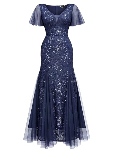 HOT ! Miusol Women's Sequin Lace Deep-V Neck Tulle Mermaid Hem Evening Party Maxi Dress